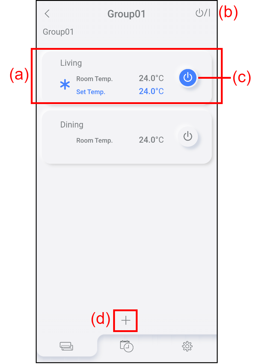 แตะ (d) เพื่อลงทะเบียนเครื่องปรับอากาศเครื่องใหม่ โปรดดู “การลงทะเบียนเครื่องปรับอากาศ” สำหรับรายละเอียด