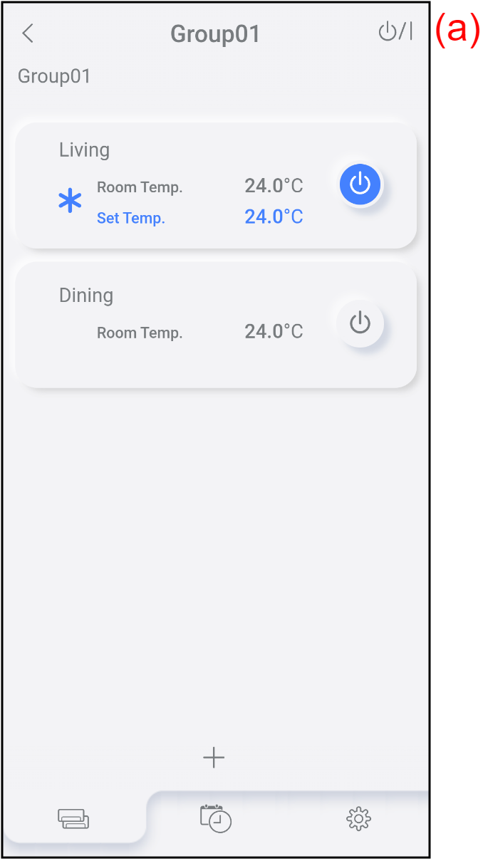 แตะ (b) เพื่อเริ่ม/หยุดการทำงานของเครื่องปรับอากาศในกลุ่มทั้งหมด โปรดดูรายละเอียดที่ “เริ่ม/หยุดการทำงานทั้งหมด” ด้านล่าง