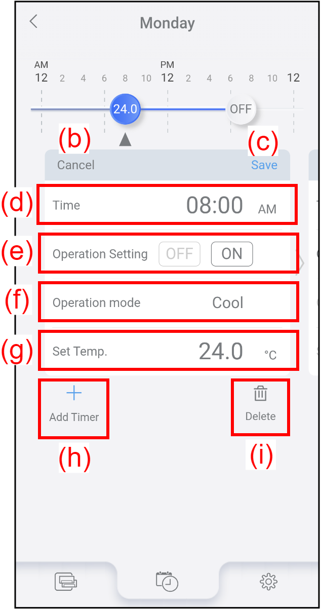 <รายการตั้งค่า>(d) Time ตั้งเวลาการทำงานแบบตั้งเวลา (e) Operation Setting OFF: เครื่องปรับอากาศหยุดการทำงานในเวลานั้น