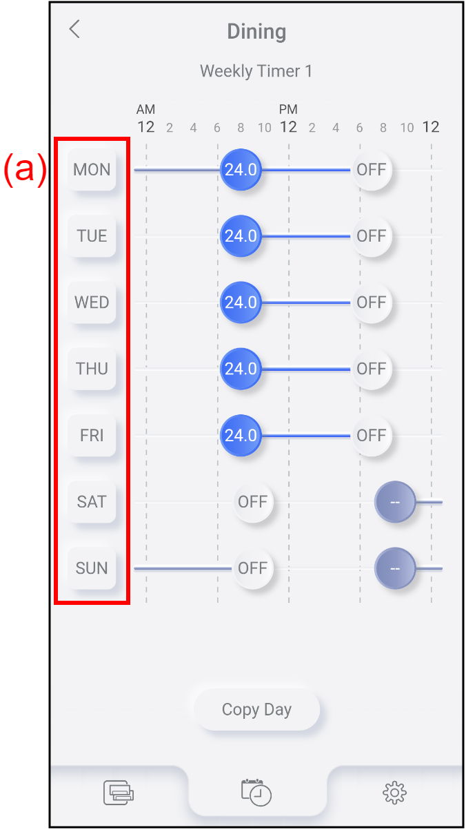 แตะวันในสัปดาห์ (a) ที่คุณต้องการเพิ่มหรือแก้ไขการตั้งค่าตัวตั้งเวลา