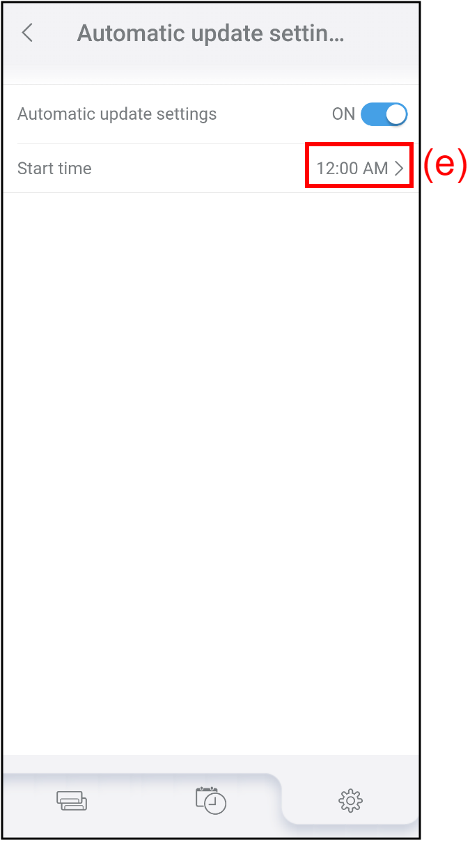 - แตะ (e) เพื่อตั้งเวลาเพื่อเริ่มการอัพเดตเฟิร์มแวร์อัตโนมัติ