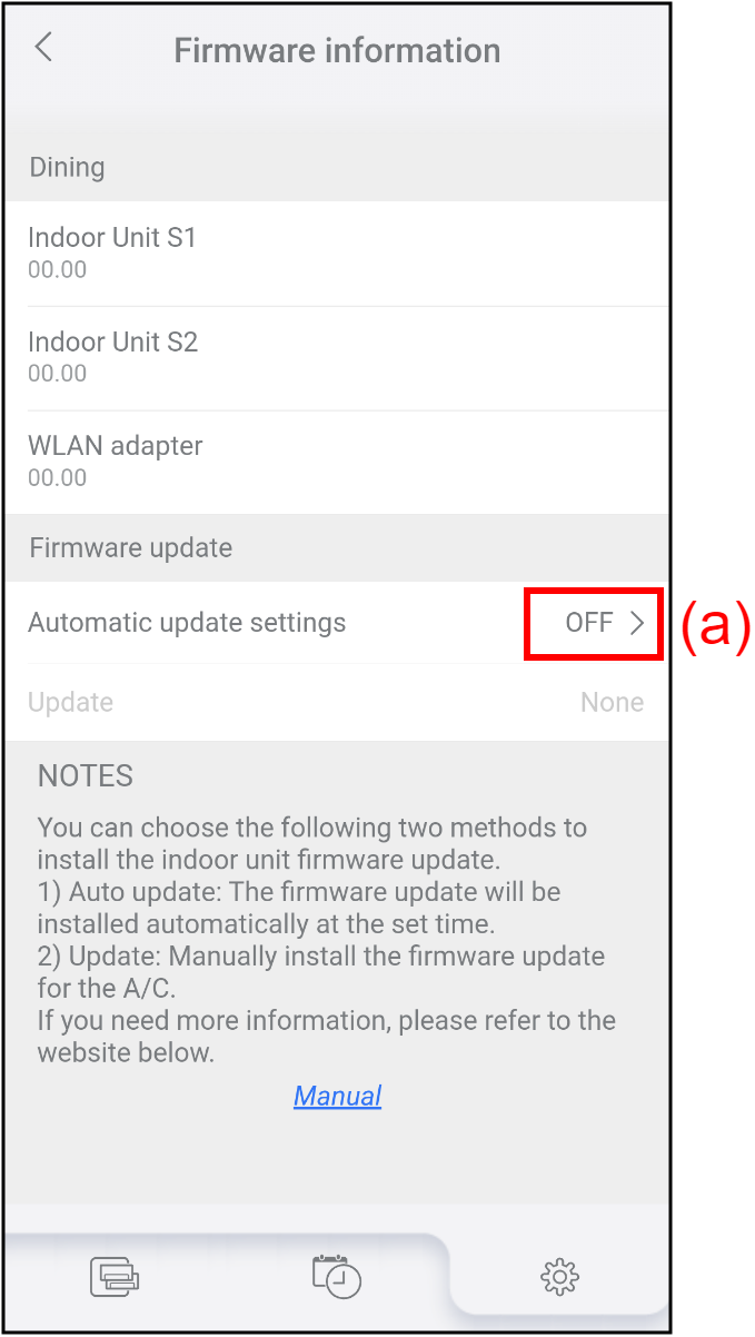 คุณสามารถตั้งเวลาเพื่อเริ่มการอัพเดตเฟิร์มแวร์เครื่องปรับอากาศและอะแดปเตอร์ WLAN โดยอัตโนมัติได้
