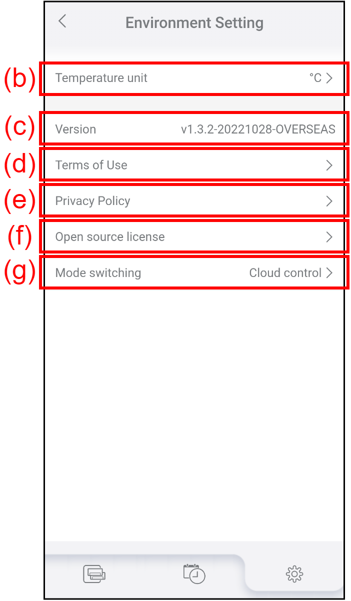 (c) Version แสดงเวอร์ชันปัจจุบันของ AIRSTAGE Mobile (d) Terms of Use แตะเพื่อตรวจเช็คข้อกำหนดการใช้งานล่าสุดสำหรับ AIRSTAGE Mobile (e) Privacy Policy แตะเพื่อตรวจสอบนโยบายความเป็นส่วนตัวล่าสุดสำหรับ AIRSTAGE Mobile (f) Open source license แตะเพื่อตรวจสอบสิทธิ์การใช้งานโอเพนซอร์สใน AIRSTAGE Mobile *สิทธิ์การใช้งานโอเพนซอร์สจะแสดงเป็นภาษาอังกฤษเท่านั้น (g) Mode switching แตะเพื่อเปลี่ยนโหมดการควบคุมT (Cloud control หรือ Direct control)