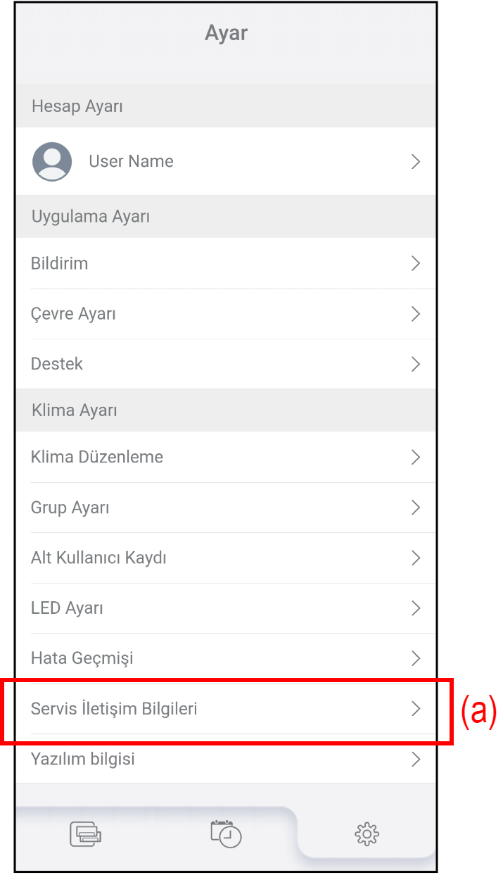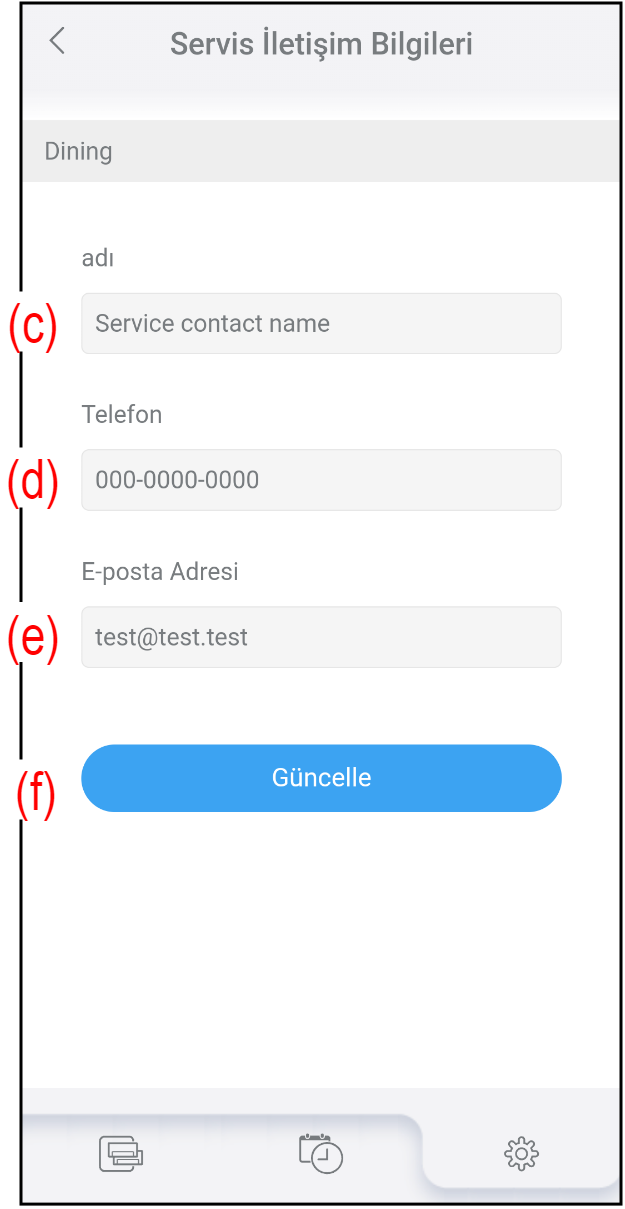1. Servis İletişim Bilgileri menüsündeki bilgileri kontrol etmek veya düzenlemek için "Ayar" ekranındaki (a) düğmesine basın.