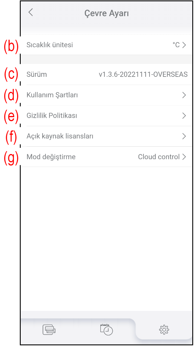 (c) Sürüm AIRSTAGE Mobile'ın mevcut sürümünü gösterir. (d) Kullanım Şartları AIRSTAGE Mobile için geçerli olan en yeni Kullanım Şartları'nı kontrol etmek için buna basın. (e) Gizlilik Politikası AIRSTAGE Mobile için geçerli olan en yeni Gizlilik Politikası'na bakmak için buna basın. (f) Açık Kaynak Lisansı AIRSTAGE Mobile'da kullanılan açık kaynak lisanslarını kontrol etmek için dokunun. *Açık kaynak lisansları sadece İngilizce gösterilir. (g) Mod değiştirme Kontrol modunu (Cloud control veya Doğrudan kontrole) değiştirmek için dokunun.