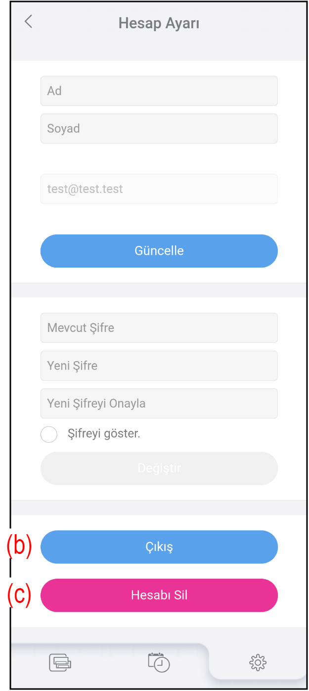 Hesabınızı bu uygulamadan ve AIRSTAGE Cloud sunucusundan silmek için (c) düğmesine basın.
