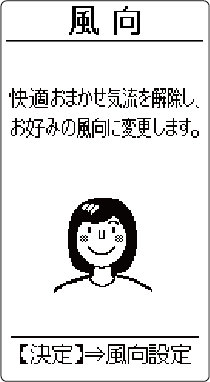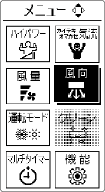 HOME 基本の使いかた スイング・ワイド ※ 操作は、運転を開始し風向板が停止してから行ってください。詳しい機能の働きを知りたい方はこちらスイングを使う操作のしかた 運転中に を押すメニュー画面が表示されます。 で を選び を押す快適おまかせ気流設定中は、下の画面が表示されます。 を押すと、快適おまかせ気流が解除され、風向選択画面になります。 でスイングを選び、 を押す▶ 次の場合は風向を変えることはできません。おまかせノクリアで運転中上下風向左右風向風向をワイドにする操作のしかた 運転中に を押すメニュー画面が表示されます。 で を選び を押す快適おまかせ気流設定中は、下の画面が表示されます。 を押すと、快適おまかせ気流が解除され、風向選択画面になります。 でワイドを選び、 を押す▶ 次の場合は風向を変えることはできません。おまかせノクリアで運転上下風向左右風向詳しい機能の働きスイングについて上下スイング:冷房や暖房など、運転の種類に合わせて、図の範囲でスイングします。除湿(再熱)・ランドリー運転中は、除湿効果を高めるために外気温やお部屋の温度によりおよそ①⇔④か、およそ⑤⇔⑧のどちらかにスイングを行います。送風運転中は、スイング風向設定前の風向位置により①⇔④か、⑤⇔⑧のどちらかにスイングを行います。冷房・除湿(再熱/弱冷房)・ランドリー・送風運転時暖房・除湿(再熱)・ランドリー・送風運転時左右スイング:室内機の据付位置の設定(→ 人感センサーと据付位置を設定する)に合わせて、次の範囲でスイングします。据付位置の設定とスイングの範囲左左吹き① ⇔ 右吹き中央左吹き② ⇔ 右吹き右左吹き② ⇔ 右吹き上下スイングと左右スイングを設定すると、上下スイングと左右スイングを組み合わせてスイングします。エアコンから風が出ていないときや、ごく弱い風で運転しているときには、スイングが一時的に止まることがあります。