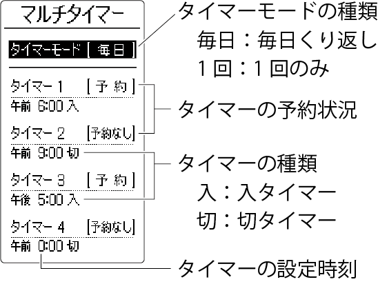 入タイマー、切タイマーを組み合わせて、最大4 回まで設定できます。