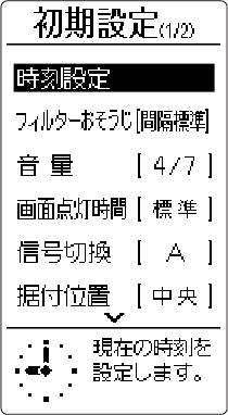 HOME 初期設定 時刻設定 リモコンの現在時刻を設定できます。※停止中のみ設定を変更できます。詳しい機能の働きを知りたい方はこちら操作のしかた 停止中に を押すメニュー画面が表示されます。 で を選び を押す で「初期設定」を選び を押す で「時刻設定」を選び を押す で時間を設定し を押し、 で分を設定し を押す詳しい機能の働き時刻設定乾電池を入れたとき、リセットボタンを押したとき、エアコン設定初期化を行ったときは自動で表示されます。 設定画面で を押して時刻を合わせ、 を押して確定します。<無線LAN の設定を行い (→スマートフォン連携)、エアコンが通信を行っている場合>エアコン本体に時刻が自動的に取得されます。このとき、リモコンから時刻設定を行うと「ピッピー」と音がなり、リモコンに表示されます。