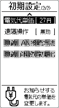 HOME 初期設定 電気代単価 お買い上げ時の設定27 円/kWh電気代の算出に用いる電気代単価を設定できます。※停止中のみ設定を変更できます。1 ~ 99 円 /kWhで設定できます。設定画面で を押すと1 円ずつ変わります。ご自宅の(電気代)契約単価は電力会社にお問い合わせください。操作のしかた 停止中に を押すメニュー画面が表示されます。 でお知らせ を選び を押す で「初期設定」を選び を押す で「電気代単価」を選び を押す でご自宅の単価に合わせ を押す