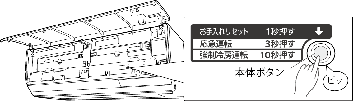 - 本体ボタンをそのまま押し続けると、応急運転・強制冷房運転になるのでご注意ください。