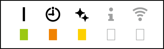 運転ランプ(緑)がおそい点滅をし(約3秒に1回)、タイマーランプ(橙)とクリーンランプ(黄)が点灯している | ||