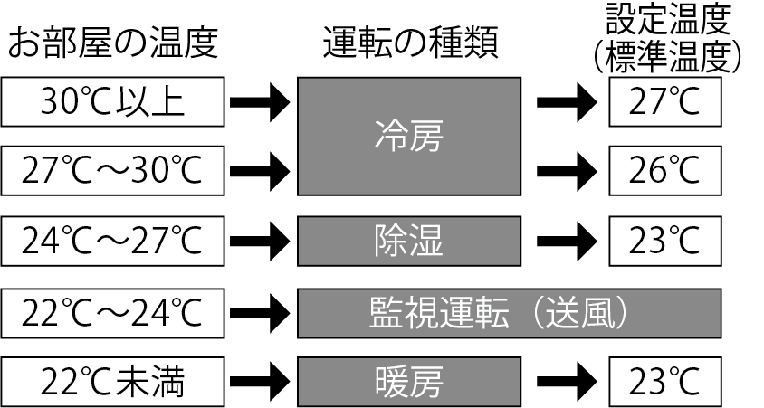 HOME 基本の使いかた 運転する(自動運転) 禁止長時間冷風を身体に当てたり、冷やしすぎたりしない。体調悪化や健康障害の原因詳しい機能の働きを知りたい方はこちら操作のしかた を押すメニュー画面が表示されます で を選び を押す で「自動」を選び を押す で温度を調節できます で運転を停止する。本体の運転ランプ(緑)が消灯し、運転を停止します。詳しい機能の働き設定温度の範囲について設定できる温度の範囲冷房運転…18 ~ 30℃暖房運転…16 ~ 30℃自動運転…標準温度※に対し、2℃高め、2℃低めの範囲※標準温度(「自動運転について」→ 運転する(自動運転))おすすめの設定温度の目安冷房運転…26 ~ 28℃暖房運転…20 ~ 24℃使用できる外気温と湿度の範囲-冷房・除湿外気温※ 1 約21 ~ 50℃お部屋の湿度 約80%以下高い湿度の中で長時間運転すると、エアコンの表面に露が付き、滴下することがあります。暖房外気温※ 1 約24℃以下ランドリー外気温※ 1 約1℃以上お部屋の湿度 約80%以下高い湿度の中で長時間運転すると、エアコンの表面に露が付き、滴下することがあります。※ 1:室外機の吸込み空気の温度上記範囲より高い温度で運転すると、自動保護装置が働き、運転を停止することがあります。また、冷房・除湿・ランドリー運転の場合、上記範囲より低い温度で運転すると、熱交換器(アルミフィン)が凍り、水もれなど故障の原因になることがあります。エアコンは、お部屋の冷房・暖房・除湿以外の目的にご使用にならないでください。室外機にオプション品を装着している場合の範囲については、オプション品の取付説明書を合わせてご確認ください。自動運転についてそのときのお部屋の状況に適した運転の種類を、自動的に設定して運転します。運転を開始したときのお部屋の温度に合わせて、次のように運転の種類と設定温度(標準温度)を選びます。AI 機能を「入」に設定している場合は、AI がお部屋の状況や、お客様の設定温度の変更パターンを学習して、設定温度を変更します。(→ AI機能)自動運転で運転を開始したときは、運転の種類を選ぶため、1 分間ごく弱い風で送風運転を行います。監視運転になるとごく弱い風で送風運転を継続し、お部屋の温度が22℃未満に変化すると暖房運転に、24℃以上に変化すると除湿運転に自動的に切り換わります。自動運転を停止した後、2 時間以内に再度運転した場合は、停止前と同じ内容の運転になります。自動運転の内容がお好みに合わないときは、手動運転(冷房・暖房・除湿・送風運転)でお使いください。