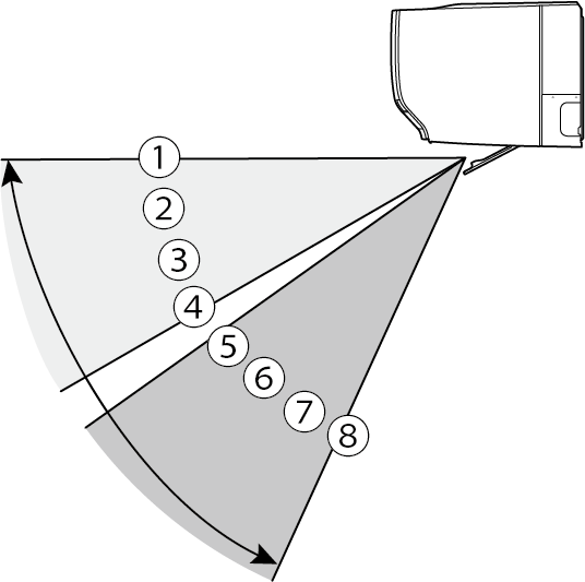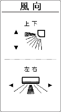 HOME 基本の使いかた 風の向きを変える ※ 操作は、運転を開始し風向板が停止してから行ってください。詳しい機能の働きを知りたい方はこちら操作のしかた 運転中に を押すメニュー画面が表示されます。 で を選び を押す快適おまかせ気流設定中は、下の画面が表示されます。 を押すと、快適おまかせ気流が解除され、風向選択画面になります。 でお好みの風向を選び、 を押す▶ 次の場合は風向を変えることはできません。おまかせノクリアで運転中上下風向左右風向詳しい機能の働き風向について冷房・暖房の効果を高めるため、上下風向は次の範囲でお使いになることをおすすめします。冷房・除湿運転:①②③④暖房運転:⑤⑥⑦⑧<風向位置について>冷房・除湿運転中は、上下風向板を長時間⑦⑧にしないでください。吹出口付近に露が付き、水滴が落ちることがあります。(⑦⑧で30 分以上運転を続けると、自動的に⑥の風向になります。)使い始めや運転モードを変更したときに、上下風向板は冷房や暖房など運転の種類に合わせて、標準風向に自動的に設定されます。(ランドリー運転は、外気温や室温により上下風向板の位置が自動設定されます。これは、除湿効果を高めるためです。)標準風向冷房・除湿・送風・ランドリー運転:①暖房・ランドリー運転:⑦暖房運転開始時などで吹き出す風の温度が低いときや自動霜取り運転時は、風が身体に当たらないように、上下風向板が一時的に①になります。自動運転の監視運転中(→ 運転する(自動運転))は上下風向板が①となります。ランドリー運転中は、除湿効果を高めるため、上下風向板を自動調整することがあります。冷房・除湿運転中に上下風向を①で運転すると、自動で風量が強くなります。また、冷房・除湿運転中に上下風向を①で 30 分以上運転を続けると、風向が自動で動くことがあります。お願い上下・左右風向板は、必ずリモコンで操作してください。手で無理に動かすと、正しく動かない場合があります。いったん運転を停止し、電源プラグを抜いて30 秒ほどしてから再度電源プラグを差し込むと、正常に戻ります。<風向ワイドについて>独立した左右風向板を、左吹き②と右吹き②の風向にし、広範囲に風を送ります。冷房・除湿運転中に左右風向をワイドで 30 分以上運転を続けると、自動的に風向の範囲が狭くなります。スイングについて上下スイング:冷房や暖房など、運転の種類に合わせて、図の範囲でスイングします。ランドリー運転中は、除湿効果を高めるために外気温やお部屋の温度によりおよそ①⇔④か、およそ⑤⇔⑧のどちらかにスイングを行います。送風運転中は、スイング風向設定前の風向位置により①⇔④か、⑤⇔⑧のどちらかにスイングを行います。冷房・除湿・ランドリー・送風運転時暖房・ランドリー・送風運転時左右スイング:室内機の据付位置の設定(→ 人感センサーと据付位置を設定する)に合わせて、次の範囲でスイングします。据付位置の設定とスイングの範囲左左吹き① ⇔ 右吹き中央左吹き② ⇔ 右吹き右左吹き② ⇔ 右吹き上下スイングと左右スイングを設定すると、上下スイングと左右スイングを組み合わせてスイングします。エアコンから風が出ていないときや、ごく弱い風で運転しているときには、スイングが一時的に止まることがあります。