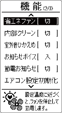 HOME 便利な機能 省エネファン お買い上げ時の設定切設定温度に到達すると自動でファンを停止させ、無駄な運転を抑えます。※ 停止中のみ設定を変更できます。詳しい機能の働きを知りたい方はこちら設定のしかた 停止中に を押すメニュー画面が表示されます。 で を選び を押す「省エネファン」を選び を押す で「入」または「切」を選び を押す詳しい機能の働き省エネファンについて室外機が停止しているときに、室内ファンを停止させます。省エネファンは、冷房運転、除湿運転、自動運転で冷房または除湿が選択された場合に動作します。除湿運転中は、お部屋の湿気戻りを抑えるため、省エネファンが常に働きます。
