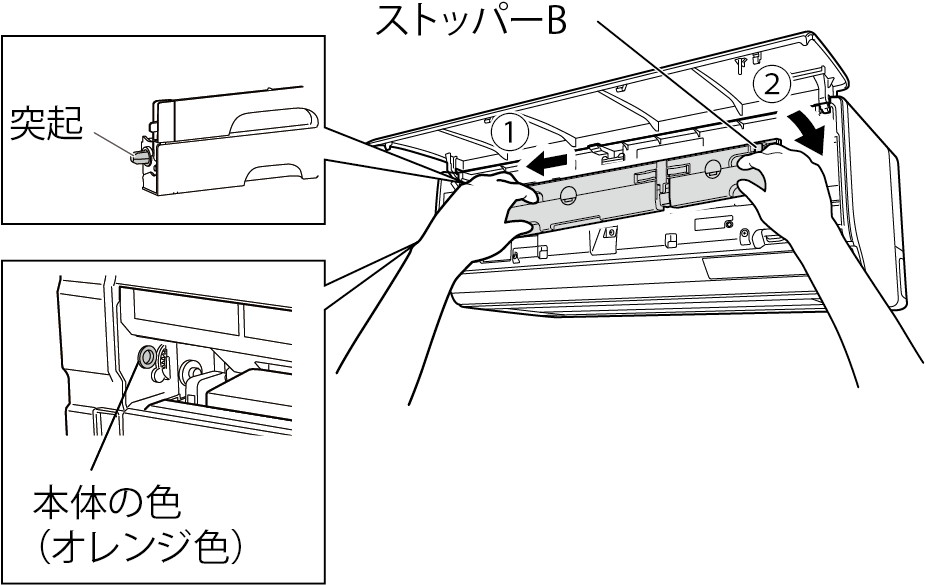 ダストボックスを取り付ける ① ダストボックスの取っ手を持ち、左側の突起を本体の穴に差し込む。 ② 右側を押してストッパーB をロックする。