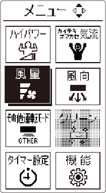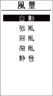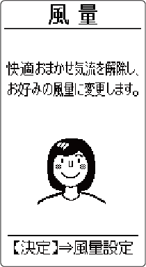 HOME 基本の使いかた 風の強さを変える 詳しい機能の働きを知りたい方はこちら操作のしかた 運転中に を押すメニュー画面が表示されます。 で風量 を選び を押す快適おまかせ気流設定中は、下の画面が表示されます。 を押すと、快適おまかせ気流が解除され、風量選択画面になります。 でお好みの風量を選び、 を押す詳しい機能の働きさらさら冷房運転中、除湿運転中、ランドリー運転中、おまかせノクリアで運転中は、風量の変更はできません。AI 自動運転開始時に風量を変更したときは、エアコンが運転の種類を選んだあとに風量が変更されます。(→ AI自動で運転する)AI 自動運転で除湿・監視運転(送風)が選ばれたときは、音声案内を行いますが、風量の変更はできません。<風量自動について>設定温度とお部屋の温度の差が大きいと強めの風で運転し、差が小さくなると徐々に弱めの風で運転します。送風運転中は、弱風で運転します。