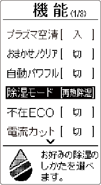 HOME 便利な機能 除湿モード 除湿モードを変更するお買い上げ時の設定再熱除湿※ 停止中のみ設定を変更できます。操作のしかた 停止中に を押すメニュー画面が表示されます。 で を選び を押す で「除湿モード」を選び を押す でお好みの除湿モードを選び を押す再熱除湿冷やして除湿した空気と暖めた空気を、エアコンの内部で混ぜて送風します。お部屋の温度の低下を防ぐため、湿気を取っても肌寒くなりにくい除湿方法です。弱冷房除湿弱い冷房で除湿する方法です。お部屋の温度はやや下がります。