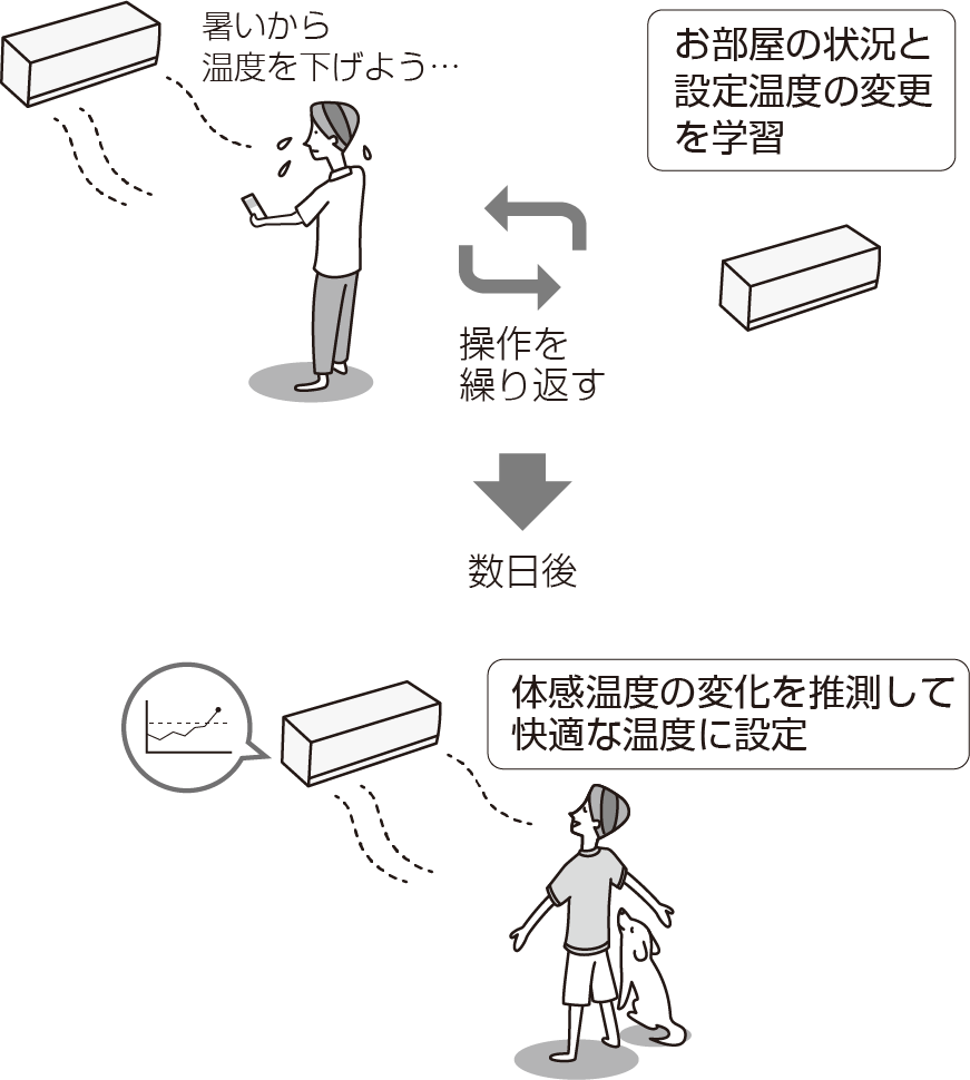 本エアコンのAIは下記の内容を学習・予測します。AI自動運転を一度行うか、「遠隔操作」を「有効」に設定して、AIの学習を開始してください。 遠隔操作を有効にする:リモコンの