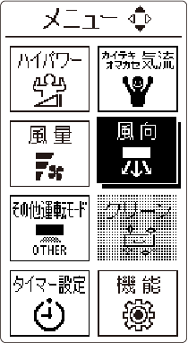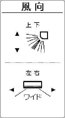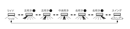 HOME 基本の使いかた スイング・ワイド ※ 操作は、運転を開始し風向板が停止してから行ってください。詳しい機能の働きを知りたい方はこちらスイングを使う操作のしかた 運転中に を押すメニュー画面が表示されます。 で を選び を押す快適おまかせ気流設定中は、下の画面が表示されます。 を押すと、快適おまかせ気流が解除され、風向選択画面になります。 でスイングを選び、 を押す▶ 次の場合は風向を変えることはできません。おまかせノクリアで運転中上下風向左右風向風向をワイドにする操作のしかた 運転中に を押すメニュー画面が表示されます。 で を選び を押す快適おまかせ気流設定中は、下の画面が表示されます。 を押すと、快適おまかせ気流が解除され、風向選択画面になります。 でワイドを選び、 を押す▶ 次の場合は風向を変えることはできません。おまかせノクリアで運転上下風向左右風向詳しい機能の働き風向ワイドについて独立した左右風向板を、左吹き②と右吹き②の風向にし、広範囲に風を送ります。冷房・除湿運転中に左右風向をワイドで 30 分以上運転を続けると、自動的に風向の範囲が狭くなります。スイングについて上下スイング:冷房や暖房など、運転の種類に合わせて、図の範囲でスイングします。ランドリー運転中は、除湿効果を高めるために外気温やお部屋の温度によりおよそ①⇔④か、およそ⑤⇔⑧のどちらかにスイングを行います。送風運転中は、スイング風向設定前の風向位置により①⇔④か、⑤⇔⑧のどちらかにスイングを行います。冷房・除湿・ランドリー・送風運転時暖房・ランドリー・送風運転時左右スイング:室内機の据付位置の設定(→ 据付位置を設定する)に合わせて、次の範囲でスイングします。据付位置の設定とスイングの範囲左左吹き① ⇔ 右吹き中央左吹き② ⇔ 右吹き右左吹き② ⇔ 右吹き上下スイングと左右スイングを設定すると、上下スイングと左右スイングを組み合わせてスイングします。エアコンから風が出ていないときや、ごく弱い風で運転しているときには、スイングが一時的に止まることがあります。