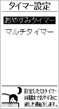 HOME 基本の使いかた おやすみタイマー 寝るときにタイマーを使うお願いあらかじめ、リモコンの時刻設定が合っていることを確認してください。(→ 時刻設定)詳しい機能の働きを知りたい方はこちら操作のしかた を押すメニュー画面が表示されます。 で を選び を押す で「おやすみタイマー」を選び を押すで時間を設定する停止するまでの時間を設定します。例)今から3 時間後に運転を停止する時間を合わせて少し待つと信号が送信され、本体のタイマーランプ(橙)が点灯して、タイマーが設定されます。を押すごとに次のように時間が変わります。時間を合わせて少し待つと信号が送信され、本体のタイマーランプ(橙)が点灯して、タイマーが設定されます。▶本体表示部詳しい機能の働きタイマー設定中は次の予約時刻を表示し、現在時刻は表示しません。停止中におやすみタイマーを設定すると、運転を開始します。おやすみタイマーが設定されているときに を押すと、タイマーが取り消されます。おやすみタイマーでは、おやすみ中、冷やしすぎや暖めすぎのないように時間の経過とともにお部屋の温度をコントロールします。設定した時間がたつとエアコンの運転を停止します。冷房運転のときおやすみタイマーを設定すると、30 分ごとに設定温度が0.5℃ずつ上がります。合計2℃上がった時点で、その温度を保ち、設定した時間後に自動的に運転を停止します。暖房運転のときおやすみタイマーを設定すると、30 分ごとに設定温度が1℃ずつ下がります。合計4℃下がった時点で、その温度を保ち、設定した時間後に自動的に運転を停止します。■設定したおやすみタイマーを取り消すとき操作のしかた を押すメニュー画面が表示されます。 で を選び を押す で「おやすみタイマー」を選び を押すで「設定取消」を選び、少し待つ信号が送信され、本体のタイマーランプ(橙)が消灯して、タイマーが取り消されます。