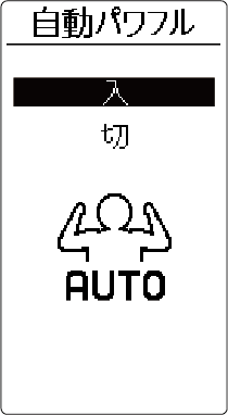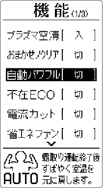HOME 便利な機能 自動パワフル お買い上げ時の設定切暖房運転使用中に自動霜取り運転に入ったあと、お部屋の温度を設定温度にすばやく戻す機能です。※ 停止中のみ設定を変更できます。詳しい機能の働きを知りたい方はこちら設定のしかた 停止中に を押すメニュー画面が表示されます。 で を選び を押す で「自動パワフル」を選び を押す で「入」または「切」を選び を押す詳しい機能の働き自動霜取り運転(→ 自動霜取り運転)終了後、自動で風量を高めた運転を行います。リモコンの風量表示は変わりません。風量を高めた運転は、お部屋の温度が十分暖まった時点で、元の設定風量に戻ります。ただし、自動霜取り運転停止後約30 分間は風量を高めた運転をします。自動パワフルは、暖房運転および AI 自動運転で暖房が選択された場合のみ動作します。お部屋の温度と設定温度の差が大きい場合には、お部屋の温度を設定温度に近づけることを優先し、暖房能力が最大となる運転を自動で行います。