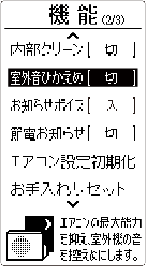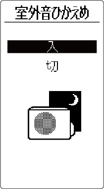 HOME 便利な機能 室外音ひかえめ お買い上げ時の設定切暖房時に運転能力を抑えることで、室外機の音を控えめにします。※ 停止中のみ設定を変更できます。詳しい機能の働きを知りたい方はこちら設定のしかた 停止中に を押すメニュー画面が表示されます。 で を選び を押す で「室外音ひかえめ」を選び を押す でお好みの設定を選び を押す詳しい機能の働き室外音ひかえめ機能を「入」に設定したときは、最大能力を抑えるため、お部屋が暖まるまで時間がかかる場合があります。お部屋の温度が設定温度に近いときなどは、室外音ひかえめ機能を「入」に設定しても、運転音が下がらない場合があります。