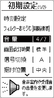 HOME 初期設定 音量 お買い上げ時の設定4詳しい機能の働きを知りたい方はこちら設定のしかた を押すメニュー画面が表示されます。 で を選び を押す で「初期設定」を選び を押す で「音量」を選び を押す でお好みの音量を選び を押す設定と同時に受信音を確認してください。詳しい機能の働きエアコンからの音声案内と受信音の音量を調節することができます。音量を「自動」に設定すると、時間帯によって次のように音量を自動で調節します。時間帯音量午前6時~午後10時4午後10時~午前6時2音量を「自動」に設定する場合、リモコンの時刻設定が合っていることを確認してください。(→ 時刻設定)