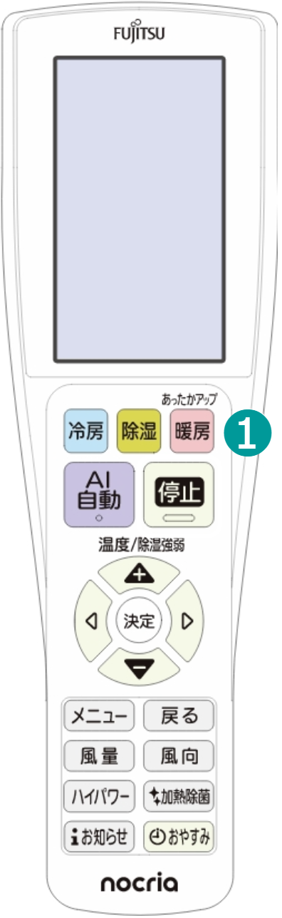 ホーム 基本の使いかた(ボタン機能) あったかアップ さらに温風で暖まる 暖房中に吹き出す風の温度を一時的に上げます。もっと暖かい風に当たりたいときにお使いください。 詳しい機能の働きを知りたい方はこちら 操作のしかた 暖房運転中に を押すあったかアップが設定され、ホーム画面に「あったかアップ暖房」と表示されます。あったかアップは、30 分後に自動で解除されます。 ■ あったかアップをやめるとき もう一度 を押すホーム画面の「あったかアップ暖房」が消灯し、暖房運転に切り換わります。 詳しい機能の働き あったかアップについて 運転モードを暖房以外に変更した場合、あったかアップは解除されます。 AI 自動運転で暖房が選択された場合や、ランドリー運転中、みまもり機能で暖房運転中、10℃暖房運転中は、あったかアップを設定することができません。 自動霜取り運転中や暖房運転開始直後は、あったかアップを設定しても吹き出す風の温度が上がらない場合があります。このとき、本体のお知らせランプ(黄)が点灯します。