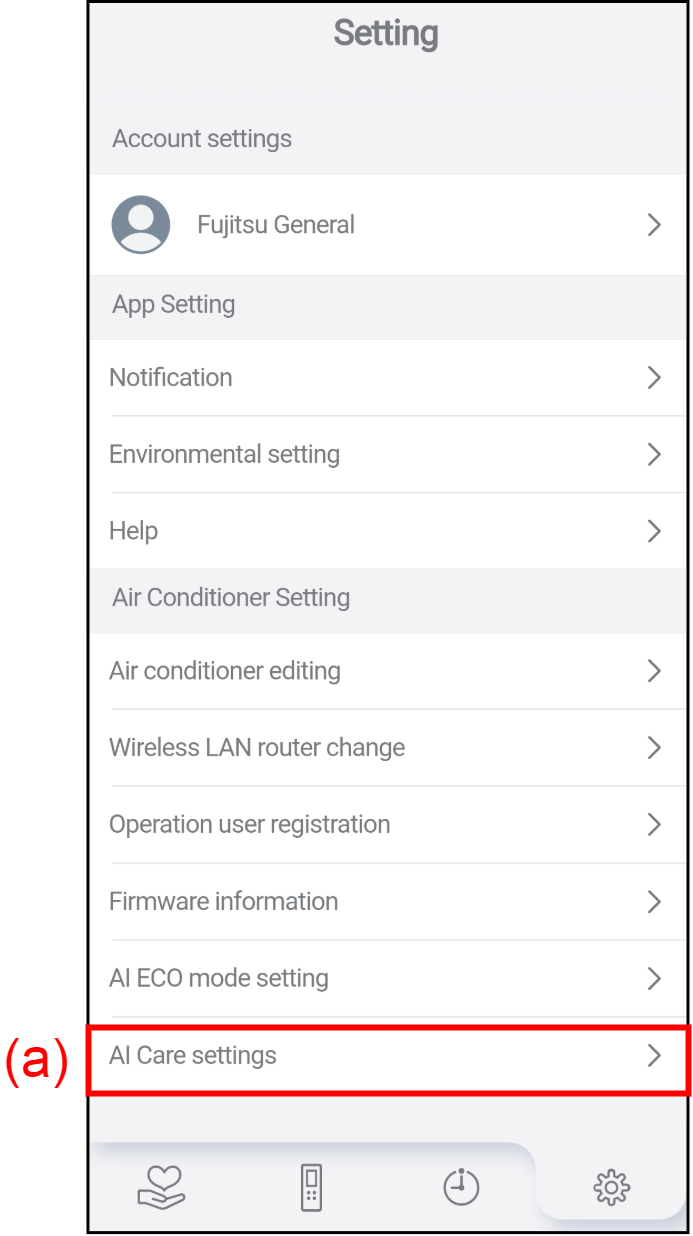 Tap (a) to display the AI Care settings screen.