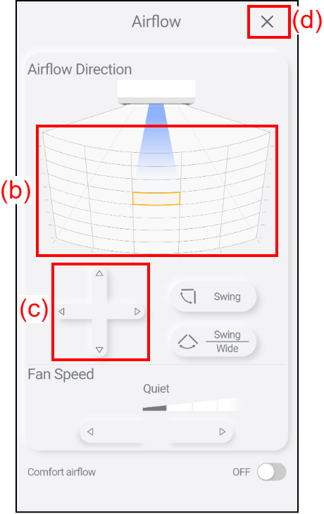 When the following screen is displayed, tap (b) to set “Comfort airflow” to “OFF.”