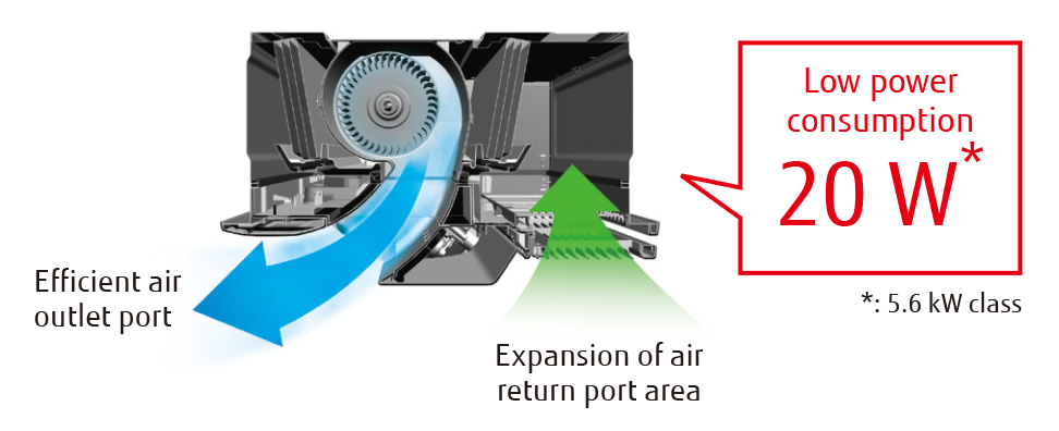 Dank der Konstruktion, durch die eine größere Luftmenge angesaugt und die Luft gleichmäßiger ausgeblasen wird, sinkt der Luftverlust, und es wird die beste Energiesparleistung der Klasse erzielt.