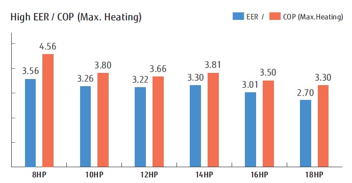 Hoher EER/COP (max. Heizleistung) für alle Modelle dank eines großen Wärmetauschers und eines hocheffizienten Scroll-Verdichters.