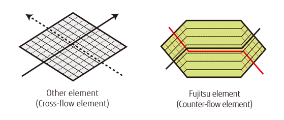 Ilma virtaa suorassa linjassa ristivirtauselementin läpi. Vastavuoroisesti ilma virtaa pidempään (pidemmän matkan) vastavirtauselementin läpi, jotta lämmönvaihto on tasaisempaa.
