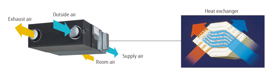 Kun huonetta viilennetään tai lämmitetään, lämmönvaihtotuuletus ottaa talteen poistettua viilennys- ja tai lämmitysenergiaa.