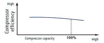Hautes performances dans toute la plage de charges du compresseur. Performances particulièrement élevées dans la plage de charges faibles à moyennes.