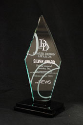 Silver plaque of “Dealer Design Awards” (left) and thin-type wall-mounted inverter split air conditioner for overseas market (right)