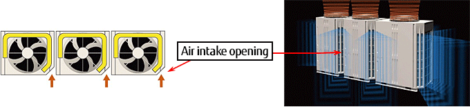 Corner cut air intake structure : Top view (left) Airflow when installing adjacently (right)