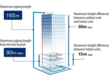 Installation for various building structure is possible by long piping design with maximum piping length 165m and maximum total piping length 1,000m and also piping length 90m from the first branch to the remotest indoor unit and the maximum height difference 15m between indoor units.