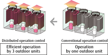The heat exchange efficiency is substantially enhanced by “Distributed operation control” function making full use of the heat exchanger of each outdoor unit according to the required capacity from indoor unit. The compressor can maintain the most efficient and stable operation without operating by the maximum load. Also, the reliability of the equipment is enhanced as the operation is not concentrated on one outdoor unit.