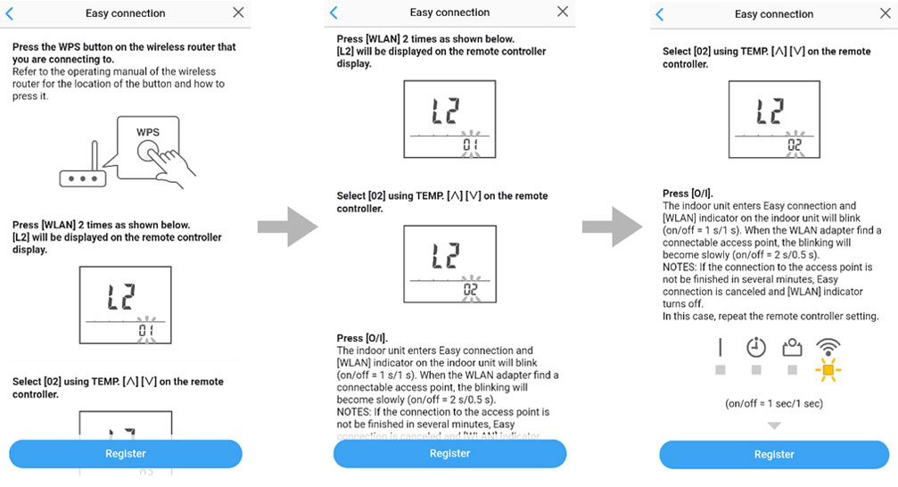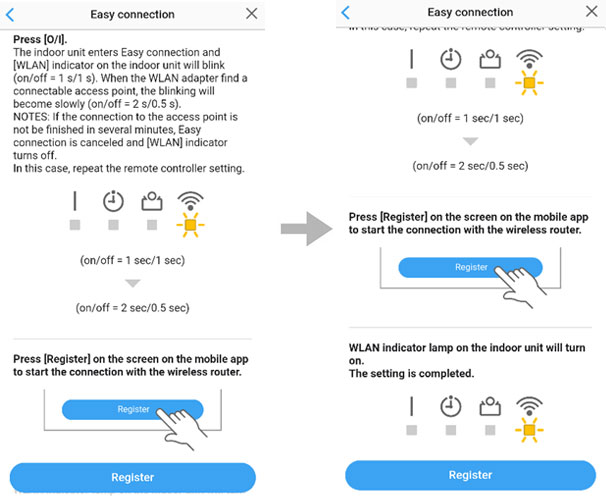Press [Register] on the screen on the mobile app to start the connection with the wireless router.