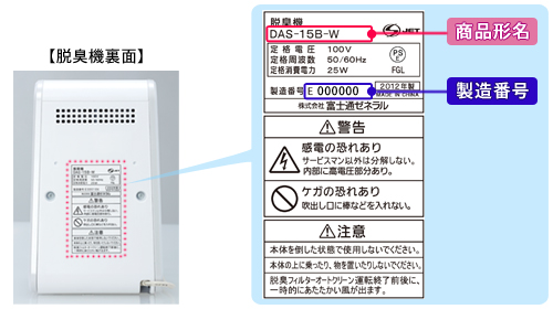 - ご購入いただいた脱臭機の「商品形名」と「製造番号」をご確認ください。