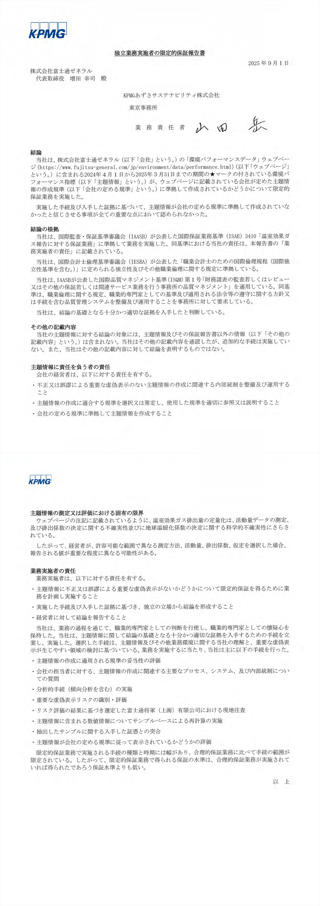 富士通ゼネラルグループは、報告内容の信頼性確保のため、温室効果ガス排出量についてKPMGあずさサステナビリティ株式会社による第三者保証を受けています。