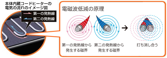 電気カーペット本体のコードヒーター内に、電流の流れる向きが反対の2本の発熱線を通しました。互いに電磁波が打ち消し合い、その発生を大幅に低減します。