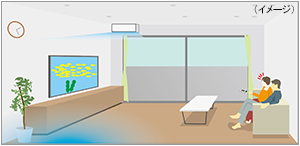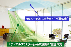 冷房時は、センター部から冷房気流を水平に吹き出し、「デュアルブラスター」からの “室温気流” が、冷房気流より強めの風速で斜め下向きに吹き出すことにより、室内の広い範囲に冷たい空気を “撹拌(かくはん)” させて温度ムラをなくし、部屋中どこでもより “自然な風” に近い快適な涼感が得られます。