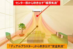 暖房時は、センター部から暖房気流を下向きに吹き出し、「デュアルブラスター」からの “室温気流” が、暖房気流を押え込むように吹き出すことにより、温風の上昇を “押え込み” 足元の低い空間だけを効果的に暖め、頭寒足熱の環境を作り出します。