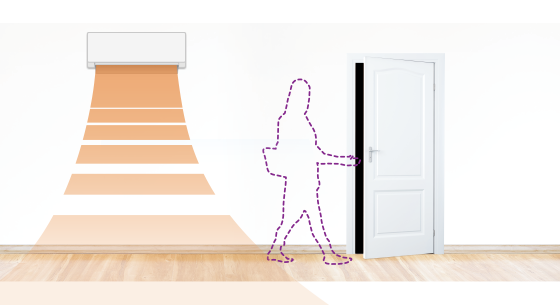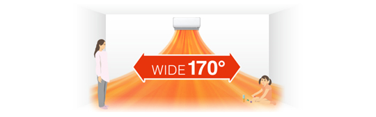 外観はコンパクトですが、独自の「パワーディフューザー® 」とビッグフラップにより、12m先※6 まで気流が届きます。さらに独自の「まがるルーバー」で風をワイドに広げ、効率よく部屋の全体に暖気を送ります。