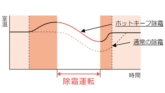 「ノクリア」GNシリーズは、「ホットキープ除霜」で霜取り運転に入る前に、あらかじめ強めに暖房して部屋を暖め、霜取り運転中の室温の低下を抑えます。
