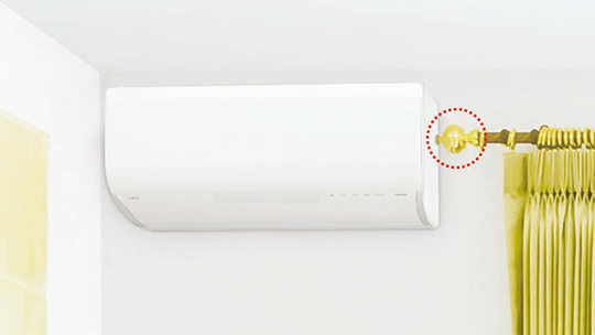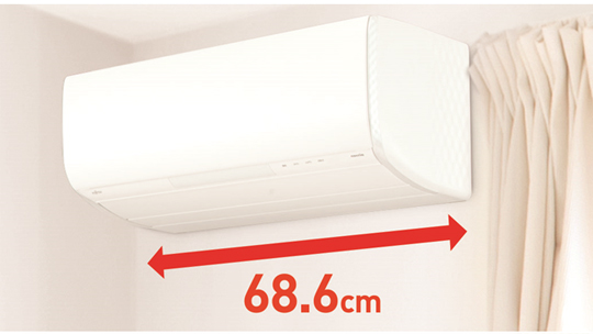 室内機の内部構造の最適化設計などにより、横幅68.6㎝のコンパクトな新フォルムで、狭い袖壁や装飾のある大型カーテンポールを取り付けている部屋など、限られたスペースへの設置が可能となりました。また、左右に余裕を生み出すコンパクト性と丸みを帯びた独自のデザインで、見た目にもゆとりのある空間を提供します。