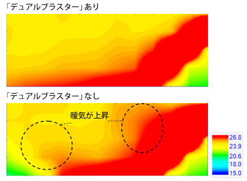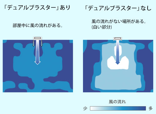 - 当社環境試験室14畳、外気温35℃、冷房運転安定時、上下風向センター気流水平、サイド気流冷房標準、風量自動。床上60㎝における風速分布を計測。「デュアルブラスター」気流ありと「デュアルブラスター」気流なしの比較。効果は使用環境により異なる場合があります。